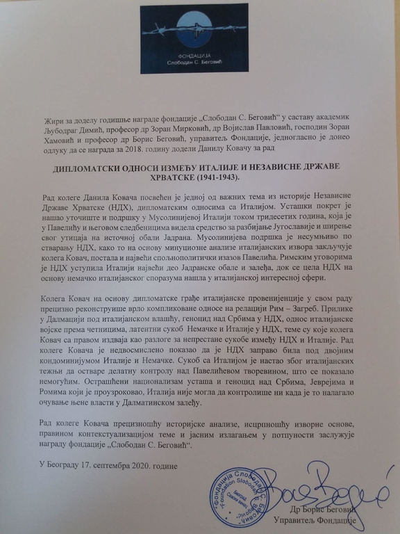 As reported by the News Agency of the Republic of Srpska SRNA, Danilo Kovač's master's thesis "Diplomatic Relations between Italy and the Independent State of Croatia (1941-1943)" was awarded, which he defended at the Faculty of Philosophy of the University of Banja Luka in 2018.