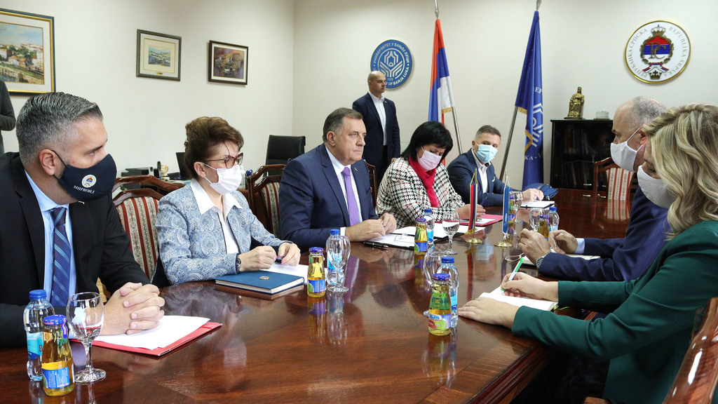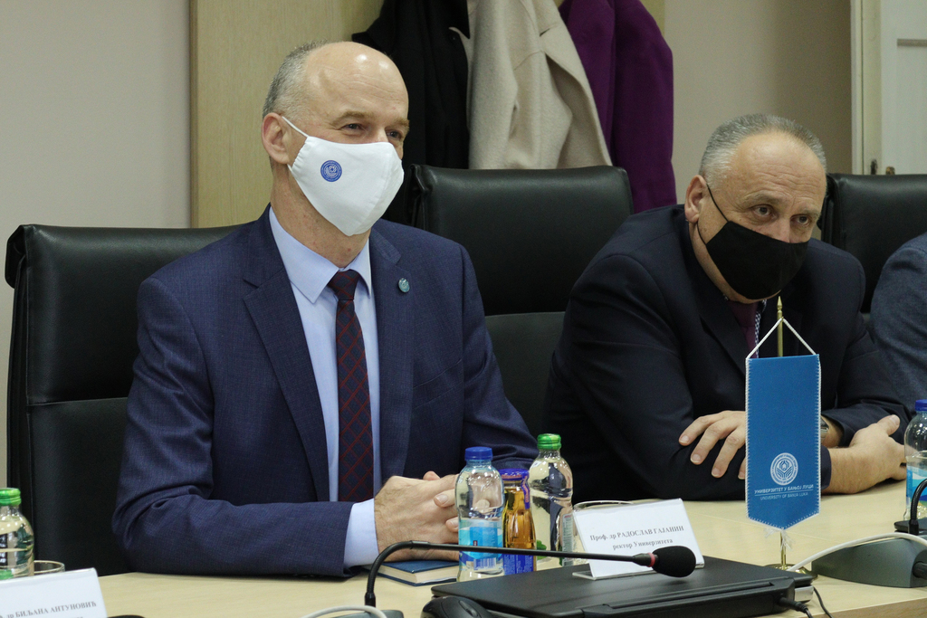 The meeting was also attended by Minister of Scientific and Technological Development, Higher Education and Information Society of the Republic of Srpska, Srđan Rajčević, MA, Minister of Finance Zora Vidović, Minister of Spatial Planning, Construction and Ecology Srebrenka Golić, Vice-Rector for International and Interuniversity Cooperation Prof. Biljana Antunović, PhD, President of the Steering Board of the University Prof. Rajko Gnjato, PhD, Dean of the Faculty of Philosophy Prof. Srđan Dušanić, PhD, Dean of the Faculty of Medicine Prof. Ranko Škrbić, PhD, Dean of the Faculty of Forestry Prof. Marijana Kapović Solomun, PhD, Dean of the Faculty of Electrical Engineering Prof. Zoran Đurić, PhD, Dean of the Academy of Arts Prof. Dragana Purković Macan, MA, as well as the Secretary General of the University Đorđe Markez, MA, and the Financial Director of the University of Banja Luka Duško Lazić.