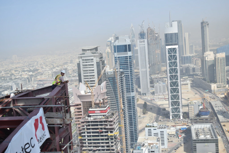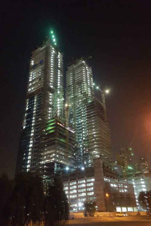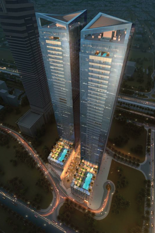 As he explained, the project consists of two 218 meters high rise residential-business towers, with the dimensions of 50 by 30 meters, located next to the longest highway in the United Arab Emirates and by air are about a kilometre away from the world's tallest building Burj Khalifa.