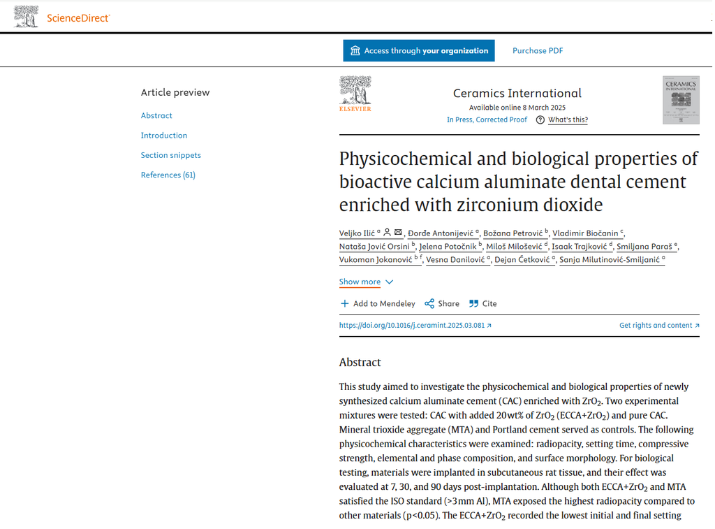 The second paper, titled “Physicochemical and biological properties of bioactive calcium aluminate dental cement enriched with zirconium dioxide” was signed by authors Veljko Ilić, Đorđe Antonijević, Božana Petrović, Vladimir Biočanin, Nataša Jović Orsin, Jelena Potočnik, Miloš Milošević, Isak Trajković, Smiljana Paraš, Vukoman Jokanović, Vesna Danilović, Dejan Ćetković, and Sanja Milutinović-Smiljanić.