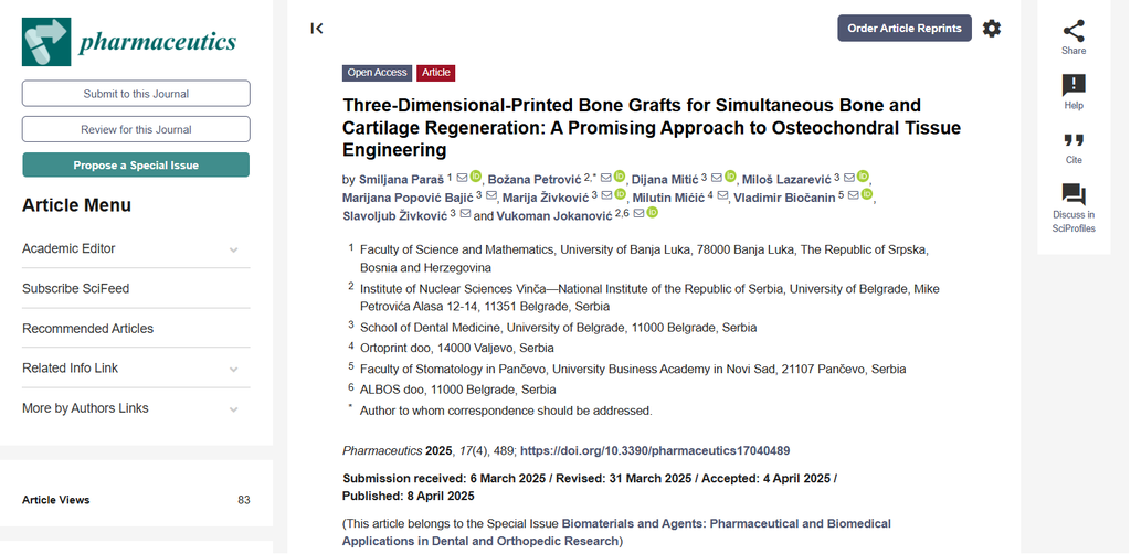 The first paper titled “Three-Dimensional-Printed Bone Grafts for Simultaneous Bone and Cartilage Regeneration: A Promising Approach to Osteochondral Tissue Engineering” was published in cooperation with prominent scientists Božana Petrović, Dijana Mitić, Miloš Lazarević, Mirjana Popović Bajić, Marija Živković, Milutin Mićić, Vladimir Biočanin, and Vukoman Jokanović.