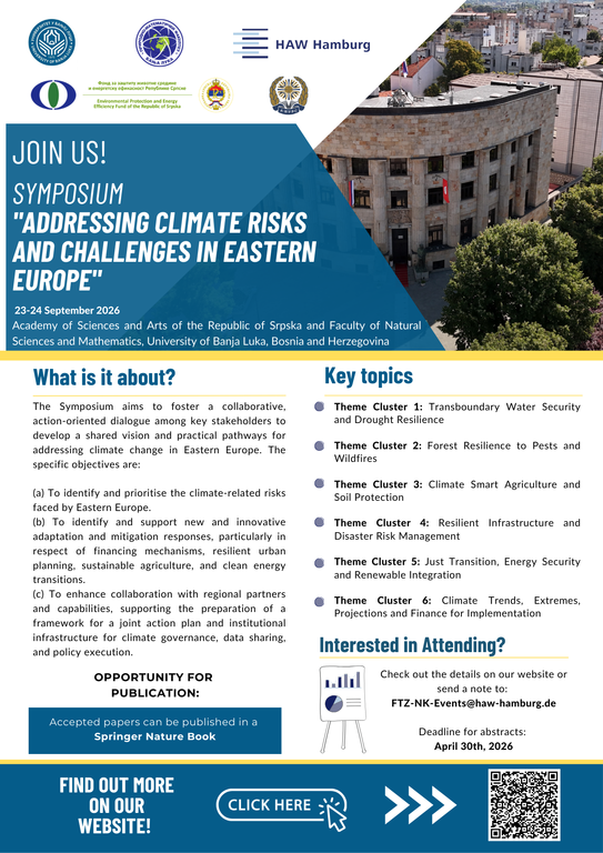 Science and developmentUniversity of Banja LukaGeneralThe Faculty of Natural Sciences and Mathematics at the University of Banja Luka and the Republic of Srpska Academy of Arts, in cooperation with the Research-Transfer Center “Sustainability and Climate Change Management” at the Hamburg University of Applied Sciences, organize an international symposium „Addressing Climate Risks and Challenges in Eastern Europe“.