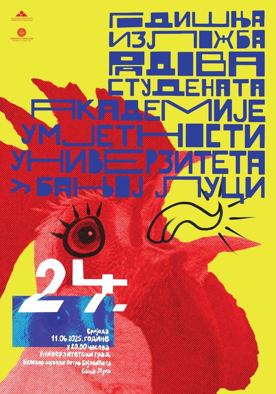 Univerzitet u Banjoj LuciOpšteGodišnja izložba radova studenata Akademije umjetnosti Univerziteta u Banjoj Luci, 24. po redu, biće otvorena 11. juna 2025. godine, u 20.00 časova, ispred zgrade Akademije umjetnosti i Rektorata.