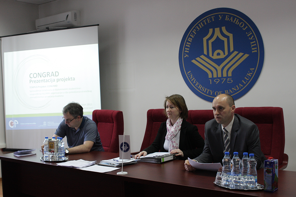 Прво истраживање о дипломираним студентима Универзитета у Бањој Луци је релизовано у оквиру међународног CONGRAD пројекта (Conducting graduate surveys and improving alumni services for enhanced strategic management and quality improvement – CONGRAD–517153–TEMPUS-1-2011-1-DE-TEMPUS-JPGR), који се финансирао средствима TEMPUS програма Европске Уније, у периоду 2012-2014. године. Овај пројекат је окупљао 14 високообразовних установа и једну независну истраживачку организацију из седам земаља: четири универзитета и три високе струковне школе из Србије, Универзитет Црне Горе, два универзитета из Босне и Херцеговине и четири универзитетска партнера из Европске уније и то из Њемачке, Чешке, Шпаније и Финске. Координатор пројекта био је Универзитет из Билефелда у Њемачкој, а институционални кординатор пројекта био је проф.др Драшко Маринковић, проректор.