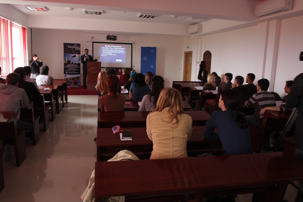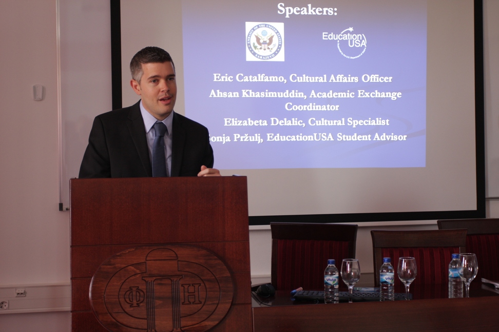 Испред Универзитета у Бањој Луци ријечи добродошлице упутила је г-ђица Јелена Рожић, стручни сарадник за међународну сарадњу Универзитета, а испред Амбасаде САД-а у БиХ поздравне ријечи упутио је г-дин Ерик Каталфамо (Eric Catalfamo), аташе за културу и образовање, који је касније објаснио и процес пријаве за добијање студентске визе САД-а. Нешто више о стипендијским програмима и о могућностима студирања у САД-у говорили су г-дин Асан Касимудин (Ahsan Khassimudin), координатор за академску размјену у Канцеларији за односе са јавношћу Амбасаде САД-а у БиХ, г-ђа Елизабета Делалић, стручни савјетник за културу и образовање у Канцеларији за односе са јавношћу Амбасаде САД-а у БиХ и г-ђица Соња Пржуљ, студентски савјетник у Америчком савјету и Савјетодавном центру за образовање САД-а.