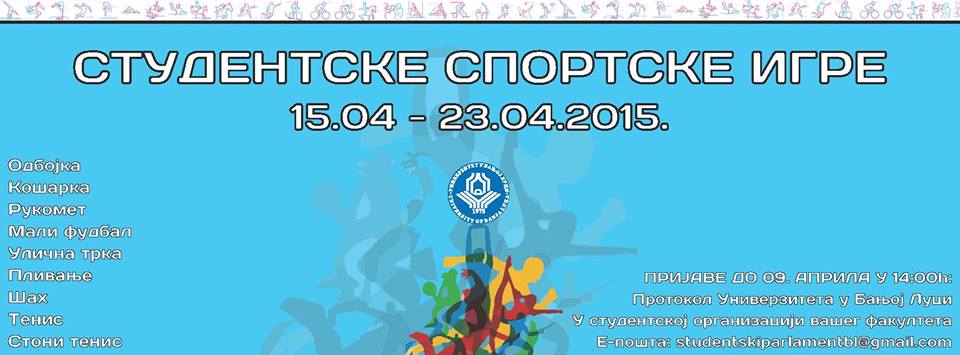Универзитет у Бањој ЛуциОпштеУ сриједу, 15. априла 2015 године почела је манифестација Студентске спортске игре коју традиционално организује Студентски парламент Универзитета у Бањој Луци . Манифестација ће трајати до 23. априла 2015. године, а током наведеног периода студенти и студентице Универзитета такмичиће се у више колективних спортова: кошарци, одбојци, рукомету и малом фудбалу.