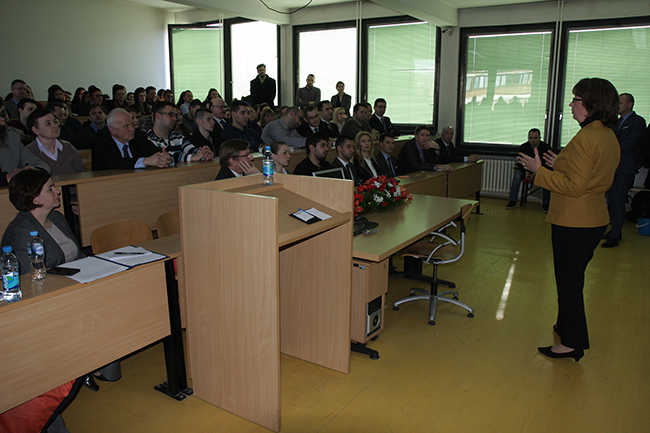 Након краћег уводног обраћања амбасадор Кормак је одговарала на бројна питања присутних студената и наставника, а која су се прије свега односила на економске перспективе БиХ на њеном путу ка Европској унији, изазове које је чекају на том путу, привлачење америчких и осталих ино-улагача на овај простор, односно стварање привлачног пословног амбијента и сл., као и на могућности усавршавања и стицања практичног знања на америчким универзитетима, односно компанијама , као и доступним фондовима за ту сврху, за шта су студенти посебно били заинтересовани да чују из прве руке од амбасадора и њених сарадника.
