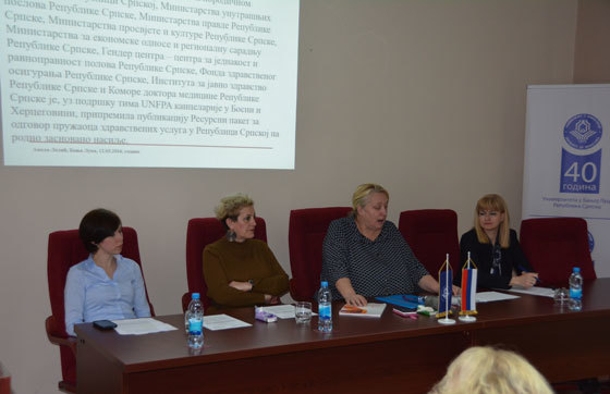 Студентима су се затим обратили: др Амела Лолић, помоћник министра здравља и социјалне заштите у Влади Републике Српске, Дијана Ђурић, психолог Фондације „Удружене жене“ и Розана Анхолт (Rosanne Anholt), магистар из области мђународног јавног здравства, са Универзитета „Vrije“ из Амстердама (Холандија). Студенти су имали прилику да се упознају са ресурсним пакетом за одговор на родно засновано насиље пружалаца здравствених услуга у Републици Српској, да на примјерима из праксе сазнају више о психолошком профилу насилника и жртава насиља, те да се упознају са међународном перспективом насиља над женама. Након излагања услиједила су бројна питања слушалаца, што свједочи о великом интересу студената за поменуту тему и њиховој спремности да дају свој допринос подизању свијести цјелокупне заједнице о проблемима родно заснованог насиља.
