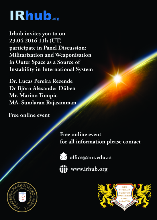 Дебата под називом “Милитаризација и наоружавање у свемиру као извор нестабилности међународног система“, организује се у оквиру пројекта IRhub.org који тежи да омогући ширу дискусију и популаризацију занимљивих тема из области међународних односа.