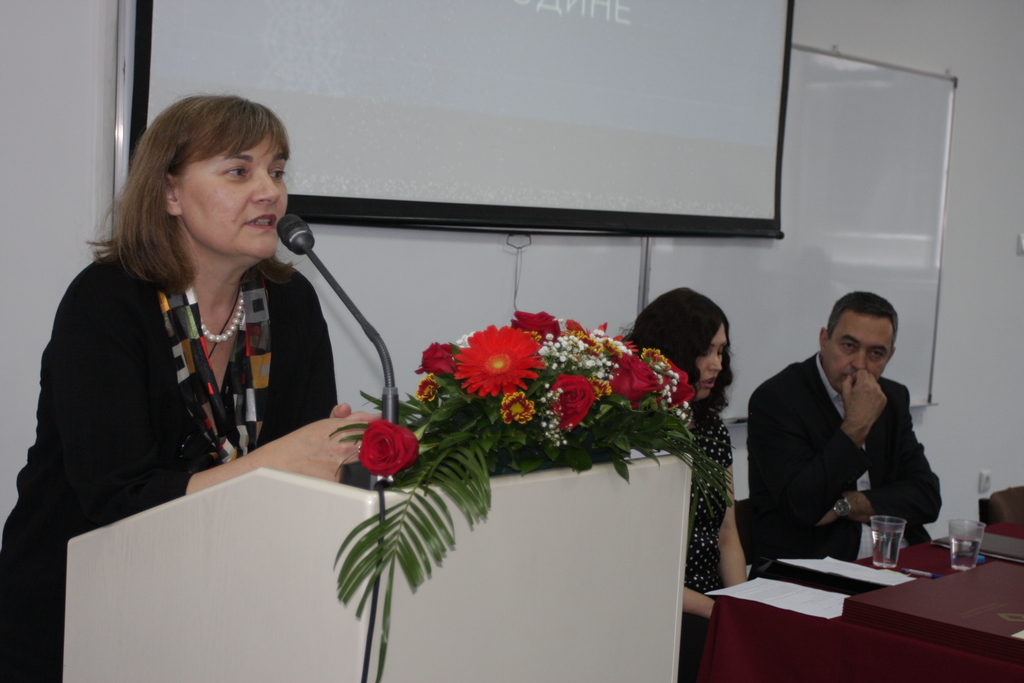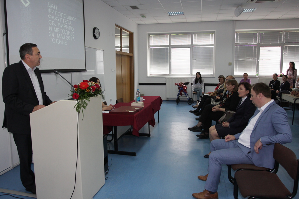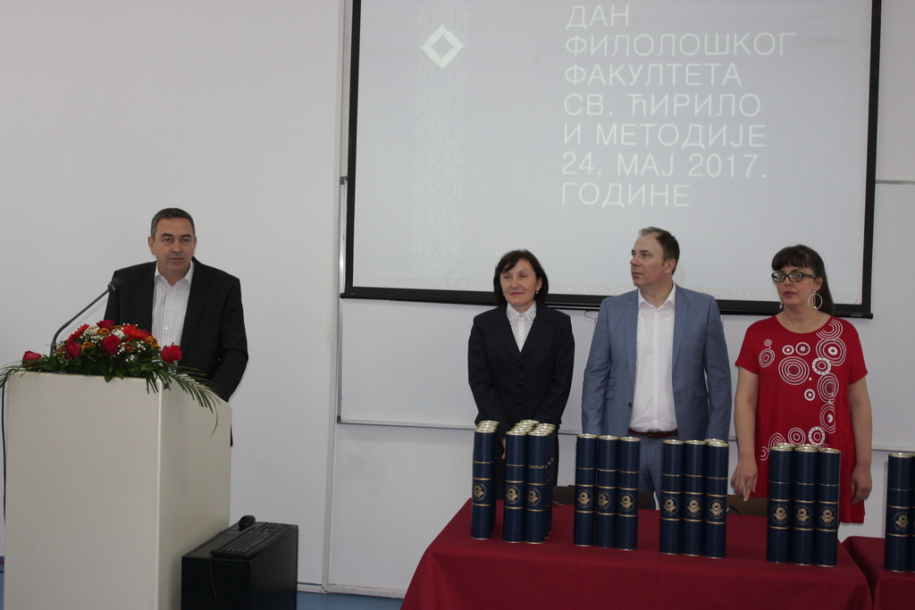 Након својеврсне ретроспективе развојног пута Филолошког факултета у протеклих осам година, услиједила је свечана бесједа проф. др Ирене Шпадијер са Филолошког факултета Универзитета у Београду која је надахнуто говорила о животу и стваралаштву Светих Ћирила и Методија те њиховим изванредним заслугама за ширење писмености међу словенским народима.