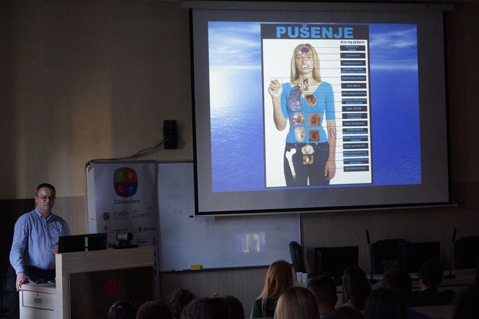 Предавање је одржао др Дарко Марковић – национални координатор за контролу дувана Републике Српске. Присутнима се обратио и представник руководства факултета, професор физиологије Ненад Понорац који обавља функцију продекана за наставу на Медицинском факултету. Продекан је истакао значај едукације становништва која води настанку новог културног односа према штетној употреби дувана и поздравио овај тип активности са намјером ширења сазнања о негативним ефектима пушења у циљу да народ буде здравији и дуговјечнији.