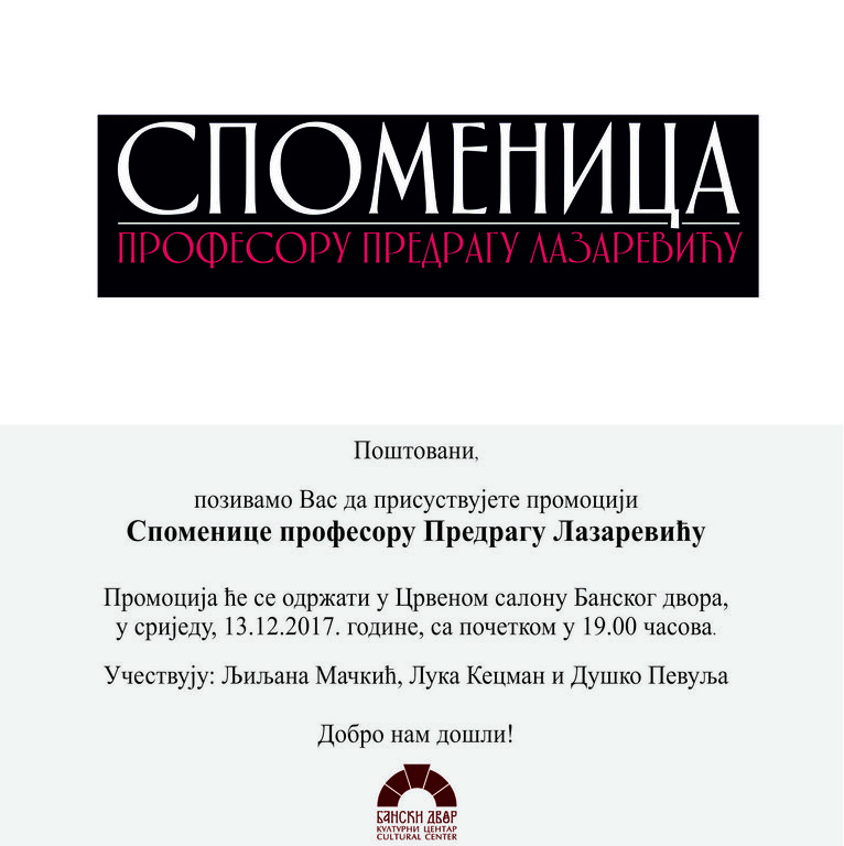 Универзитет у Бањој ЛуциОпштеПромоција Споменице о професору Предрагу Гуги Лазаревићу заказана је 13. децембара 2017. године у 19.00 часова у Црвеном салону Културног центра Бански двор.