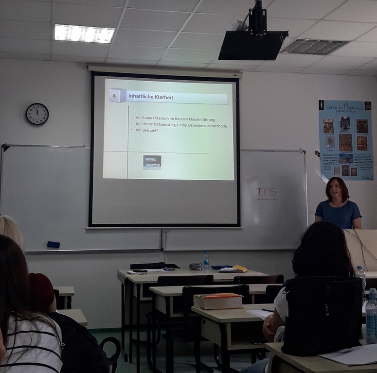У оквиру посјете она је одржала неколико предавања студентима 3. и 4. године на Студијском програму њемачког језика и књижевности, присуствовала заједничким часовима студената 3. године Студијског програма енглеског језика и књижевности и Студијског програма њемачког језика и књижевности и посјетила бесплатне курсеве које изводе студенти 4. године Студијског програма њемачког језика и књижевности. Заједно са студентима учествовала је у анализи одржаних часова.