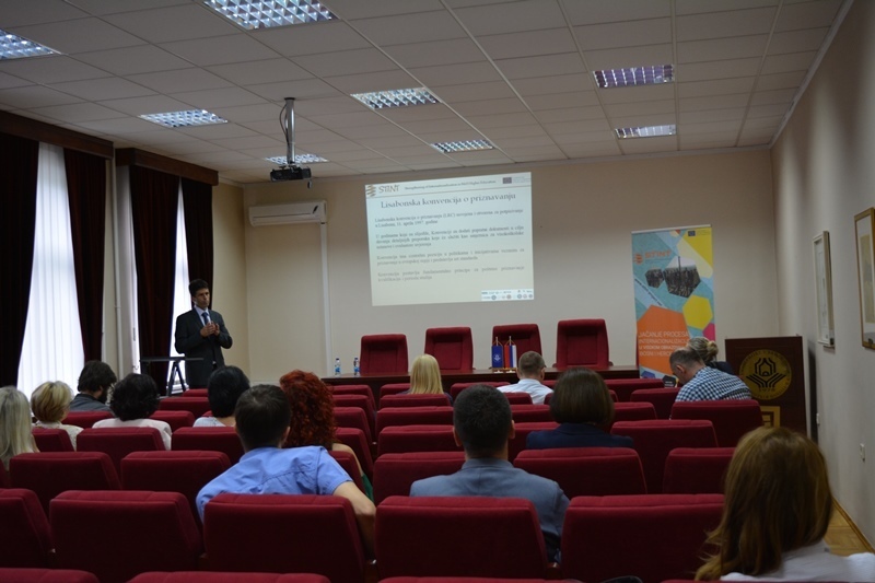 Џенан Омановић, шеф Одсјека за информисање и сарадњу у Центру за информисање и признавање докумената из области високог образовања, учесницима Радионице пренио је корисне информације о европском приступу у области признавања иностраних високошколских квалификација и ENIC/NARIC мрежама, Лисабонској конвенцији о признавању, признавању и Болоњском процесу, европским документима из области образовања, те Моделу академског признавања на јавним високошколским установама.