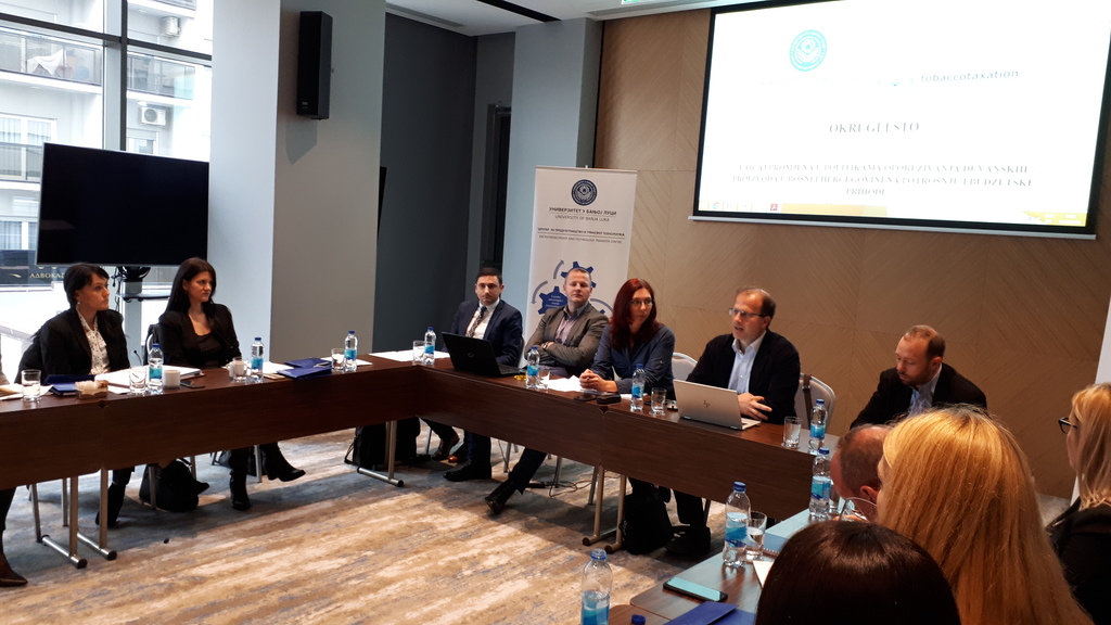 Укупно 20 представника из 9 институција узело је учешће у округлом столу. Поред представника истраживачког тима са Универзитета у Бањој Луци (Центар за предузетништво и трансфер технологија – ЦПТТ, те Економски факултет) као партнера у пројекту из БиХ, учешће су узели и представници Института економских наука из Београда као координатори пројекта за регион Западног Балкана, Управе за индиректно опорезивање БиХ, Министарства финансија Републике Српске, Министарства здравља и социјалне заштите Републике Српске, Фискалног савјета Републике Српске, Института за јавно здравство Републике Српске и Фонда здравственог осигурања Републике Српске. Резултате до којих је дошао истраживачки тим Универзитета у Бањој Луци представио је доц. др Драган Глигорић, координатор истраживачких активности пројекта и Љубиша Мићић, ма, истраживач. Глигорић је присутнима сумирао резултате истраживања са фокусом на еластичност преваленције пушења и цјеновне еластичности за количину тражених цигарета по различитим доходовним групама домаћинстава, наглашавајући значај резултата за будућа разматрања приликом промјена политика опорезивања дувана и дуванских производа. Мићић је представио резултате симулација повећања специфичне акцизе за 10%, 25% и 50%, те утицај тог повећања на потрошњу и јавне приходе, укључујући и резултате симулације са фокусом на различите доходовне групе домаћинстава. Резултати економске анализе доступних података показују да се ефекат повећања акциза на дуванске производе може измјерити и да повећање акциза може имати ефекта на смањење потрошње цигарета и истовремено повећање јавних прихода. Користи од повећања специфичне акцизе су веће и за друштво и за јавни буџет (у смислу смањења трошкова за здравство услијед смањене потрошње цигарета). Међутим, ефекат политика опорезивања дувана и дуванских производа у смислу повећања цијена цигарета се разликује између домаћинстава у зависности од тога којој доходовној групи припадају. У суштини, адекватне политике опорезивања дувана и дуванских производа имају значајан утицај на потрошњу цигарета, али промјене у цијени и приходима имају различите ефекте на различите социо-економске групе. Пројекат „Убрзавање напретка у опорезивању дувана и дуванских производа у земљама са ниским и средњим приходом“ (eng. “Accelerating Progress on Tobacco Taxes in Low-and Middle Income countries“) реализује Центар за предузетништво и трансфер технологија Универзитета у Бањој Луци, уз финансијску подршку Блумберг фондације (САД) путем Универзитета Илиноис из Чикага као кровне организације и Института економских наука Београд као регионалног координатора на простору Западног Балкана.