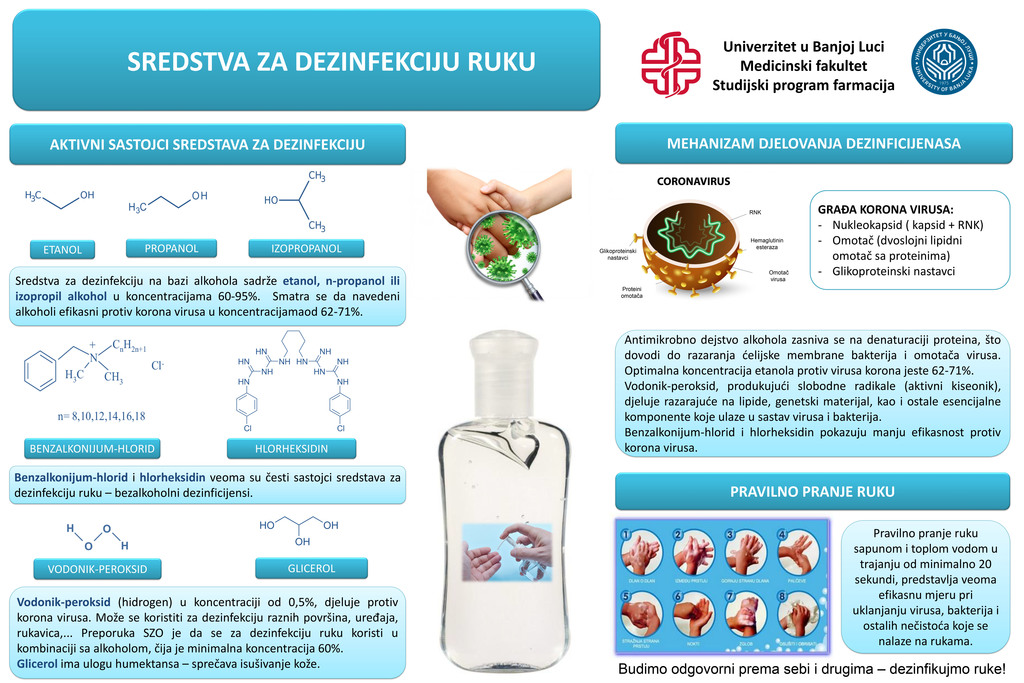 Универзитет у Бањој ЛуциОпштеСтудијски програм фармација Медицинског факултета Универзитета у Бањој Луци, припремио је детаљно упутство за дезинфекцију руку.
