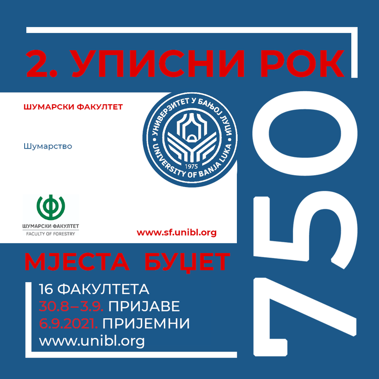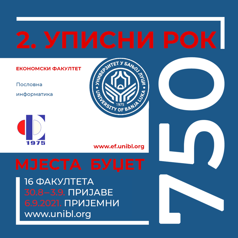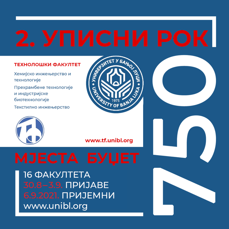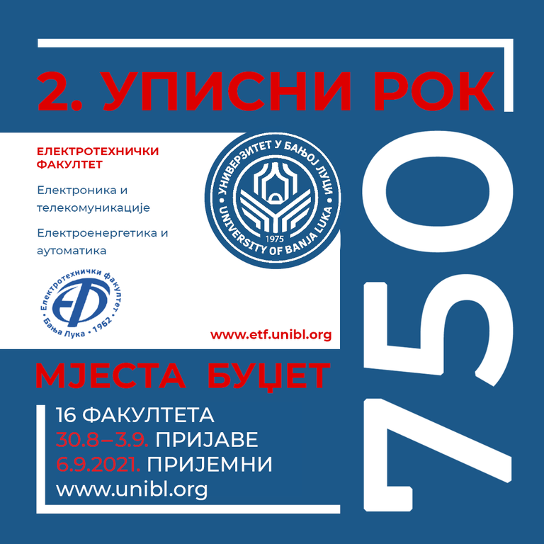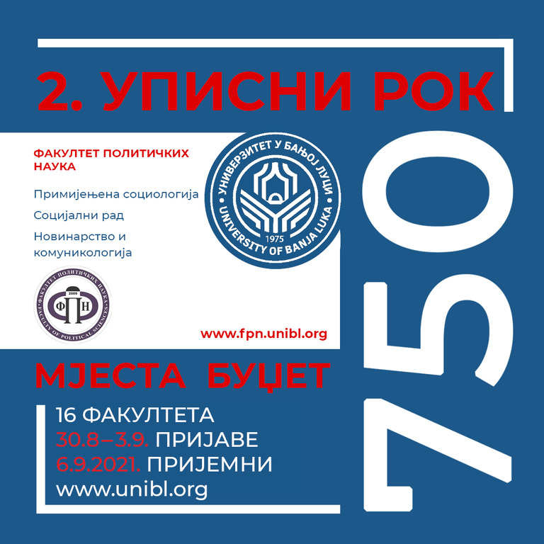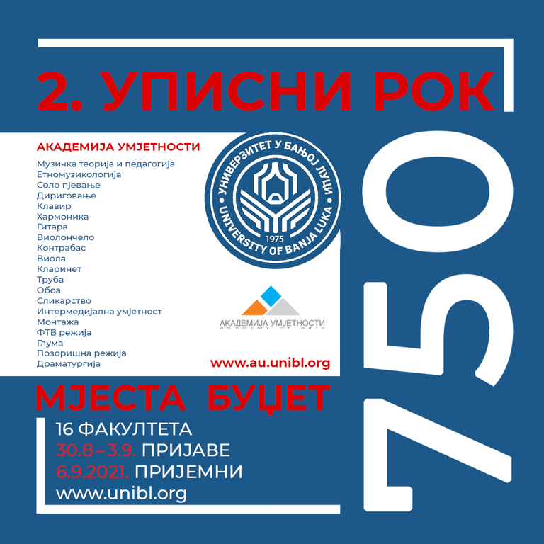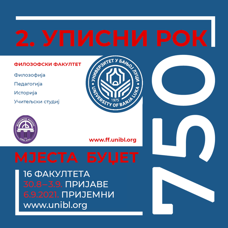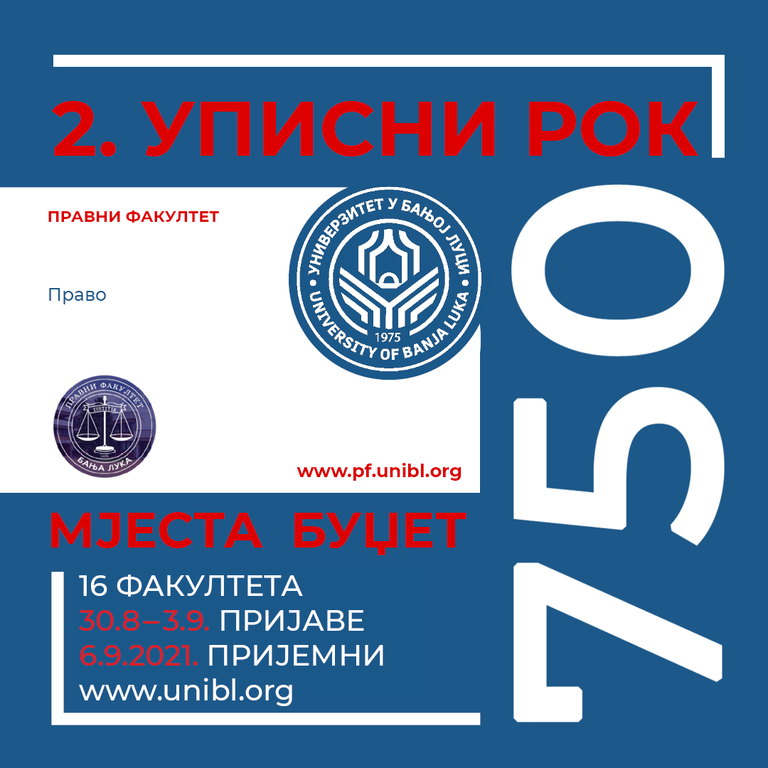 Конкурс за упис студената у другом уписном року биће објављен 18. августа 2021. године на интернет страници Универзитета у Бањој Луци и у дневним новинама ,,Глас Српске’’.