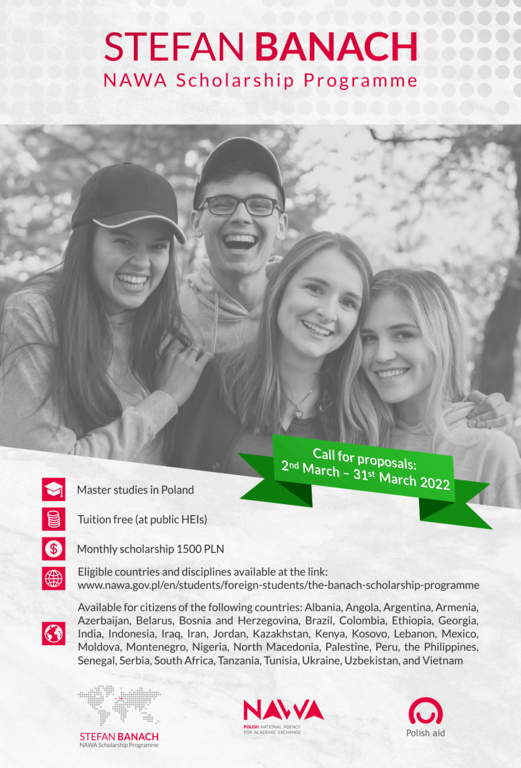 Стипендије и програмиПољска национална агенција за академску размјену NAWA у сарадњи са Министарством спољних послова објављује отварање позива за пријаве за стипендију Стефан Банах која је намијењена студентима из земаља у развоју, укључујући Босну и Херцеговину.