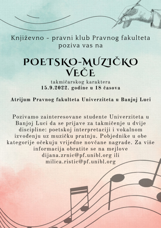 ОпштеОбјављен је позив за учешће на Поетско-музичкој вечери која ће бити одржана 15. септембра 2022. године у 18 часова у атријуму Правног факултета Универзитета у Бањој Луци.