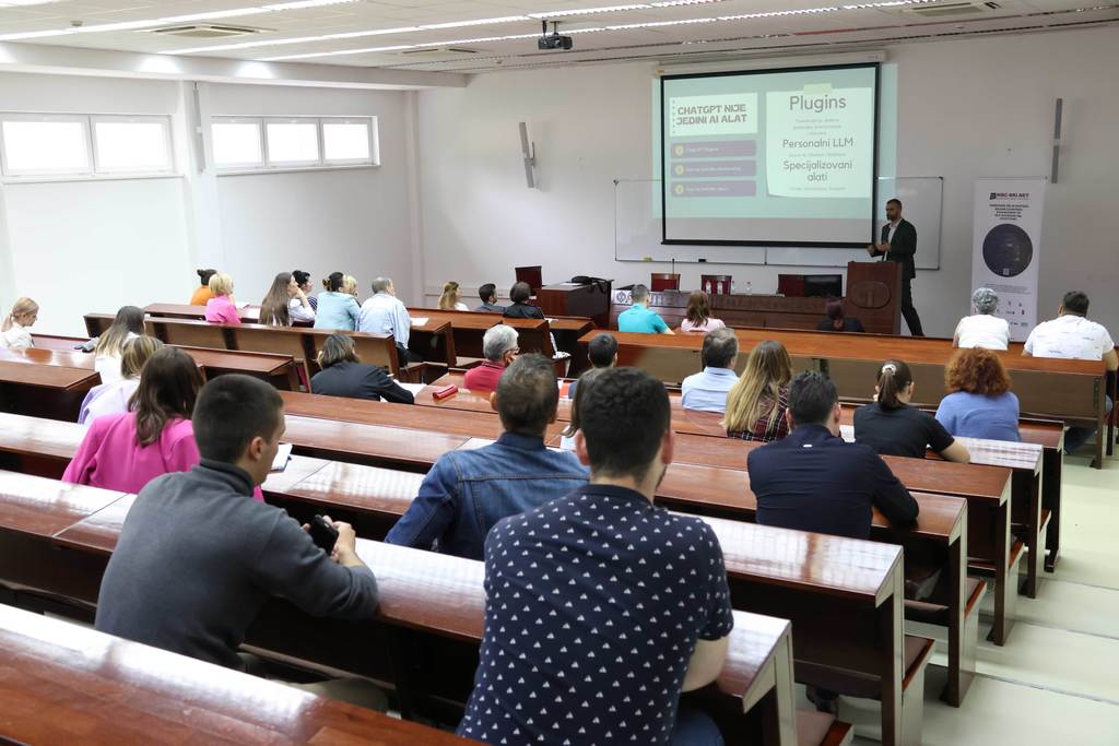 Први дио догађаја одржан је у форми презентација. Др Анђела Пепић, која руководи Центром за развој и подршку истраживању Универзитета у Бањој Луци, нагласила је важност поштовања етичких принципа у кориштењу вјештачке интелигенције у образовању и науци, попут: транспарентности, недискриминације, добробити друштва, одговорности и приватности и управљања подацима. Борислав Вукојевић, виши асистент на Факултету политичких наука Универзитета у Бањој Луци, кроз практичне примјере презентовао је корисност вјештачке интелигенције као алата за повећање продуктивности.