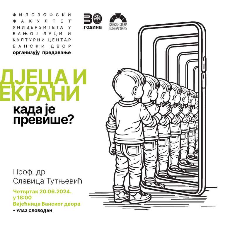Универзитет у Бањој ЛуциОпштеВанредна професорка Филозофског факултета Универзитета у Бањој Луци др Славица Тутњевић одржаће 20. јуна 2024. године, у 18 часова, предавање на тему ,,Дјеца и екрани – када је превише?’’.