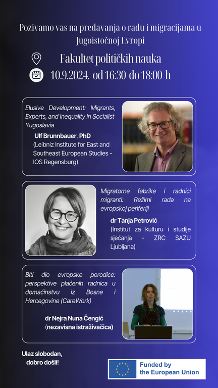 Треће предавање ,,Бити дио европске породице: перспективе плаћених радница у домаћинству из Босне и Херцеговине (CareWork)’’ одржаће др Нејра Нуна Ченгић, која се бави антропологијом и независним истраживањем. Истраживачки фокус др Ченгић обухвата трансформације рада у Босни и Херцеговини, с посебним освртом на утицај међународних интервенција и пројектно финансиран рад, као и женски плаћени рад његе и бриге унутар приватних домаћинстава у БиХ и шире. Током задње три године радила је постдокторска истраживања Marie Curie стипендије на Универзитету у Грацу, у Центру за југоисточне европске студије.