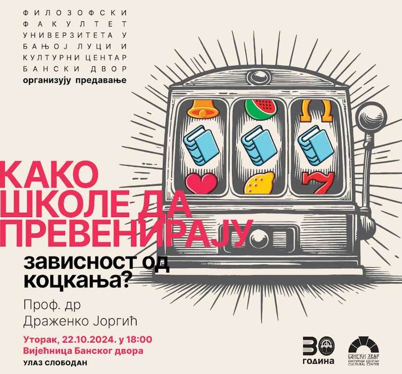 Универзитет у Бањој ЛуциОпштеРедовни професор Филозофског факултета Универзитета у Бањој Луци др Драженко Јоргић одржаће 22. октобра 2024. године, у 18 часова, у Вијећници Културног центра „Бански дворˮ у Бањој Луци, предавање „Како школе да превенирају зависност од коцкањаˮ.