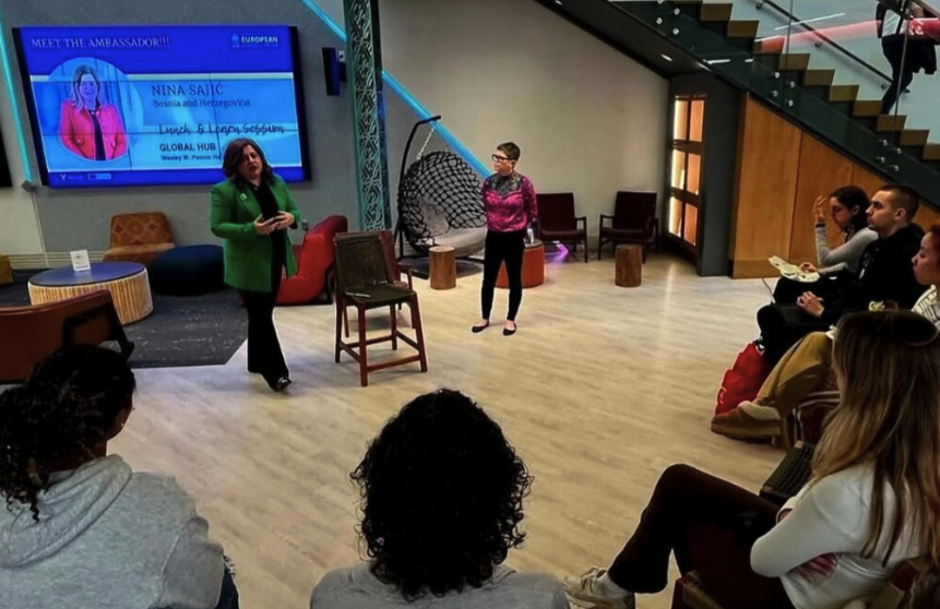 Поред тога, доц. др Сајић је учествовала као панелиста на симпозијуму о анти/демократији, који је организовао Центар за европске студије Универзитета у Питсбургу. На овом догађају, заједно са осталим учесницима, дискутовала је о актуелним изазовима демократије у савременом свијету. Током боравка, учествовала је и на догађају „Упознајте амбасадора“, гдје је студентима говорила о изазовима дипломатске каријере и значају дипломатије у међународним односима.