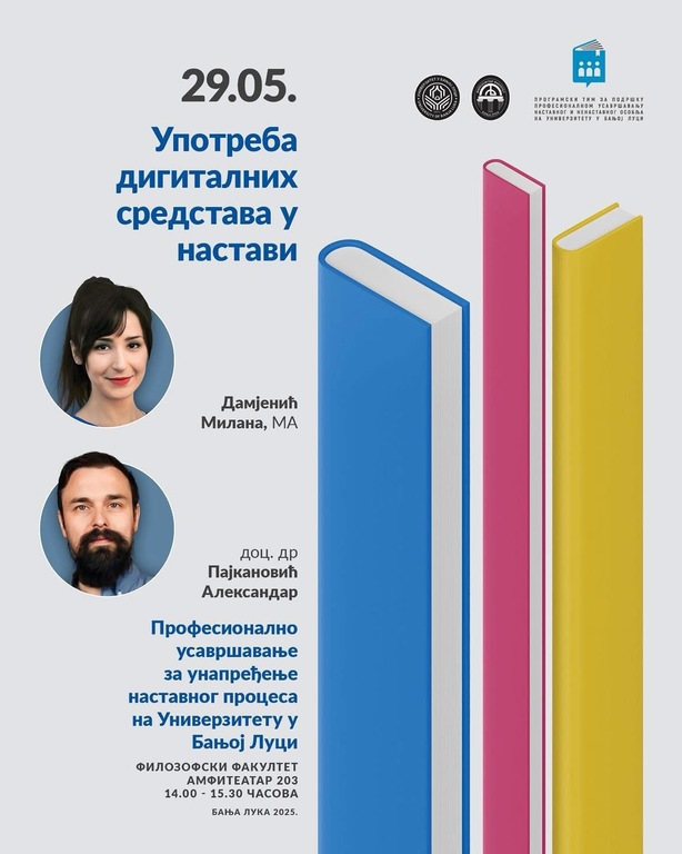 Универзитет у Бањој ЛуциОпштеИнтерактивно предавање под називом „Употреба дигиталних средстава у настави” биће одржано 29. маја 2025. године, на Филозофском факултету Универзитета у Бањој Луци, са почетком у 14.00 часова.