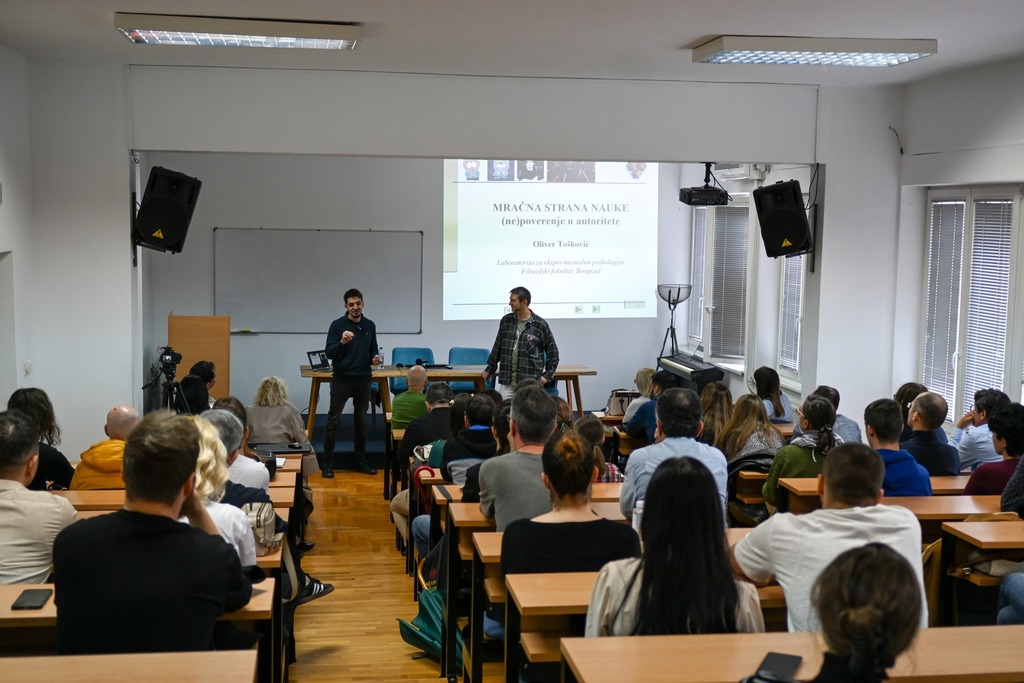 Предавање је одржао сарадник Лабораторије за експерименталну психологију Филозофског факултета Универзитета у Београду др Оливер Тошковић, који је публику провео кроз сложене теме повјерења у научне ауторитете, освјетљавајући и историјске и савремене дилеме које прате научни рад и његову рецепцију у јавности.