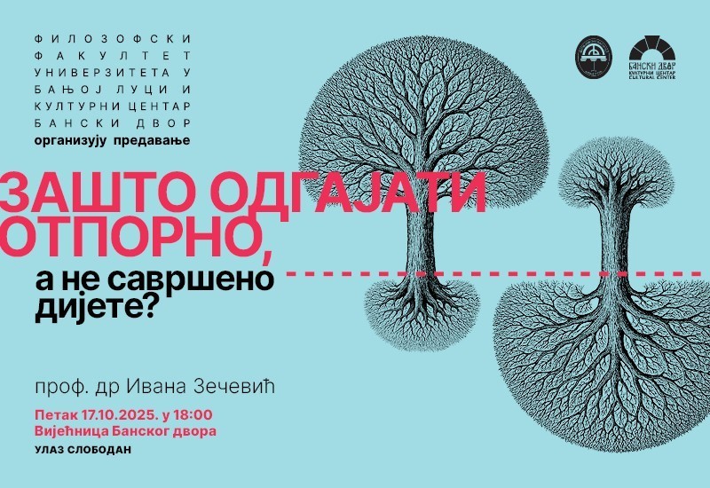 Универзитет у Бањој ЛуциОпштеПредавање под насловом „Зашто одгајати отпорно, а не савршено дијете?ˮ одржаће редовни професор Филозофског факултета Универзитета у Бањој Луци др Ивана Зечевић, у петак, 17. октобра 2025. године, са почетком у 18.00 часова, у Вијећници Културног центра ,,Бански дворˮ.