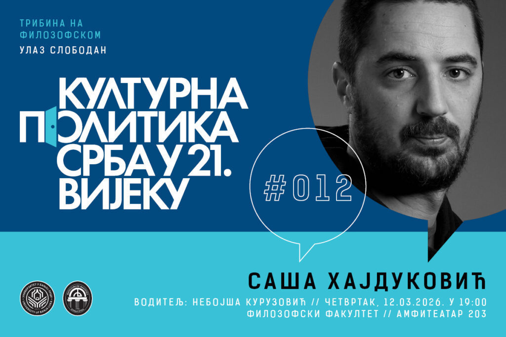 Универзитет у Бањој ЛуциОпштеГост на дванаестој трибини серијала „Културна политика Срба у 21. вијеку”, која ће бити одржана у четвртак, 12. марта 2026. године, у 19 часова, у амфитеатру 203 Филозофског факултета Универзитета у Бањој Луци, биће режисер и професор Академије умјетности Универзитета у Бањој Луци мр Саша Хајдуковић.